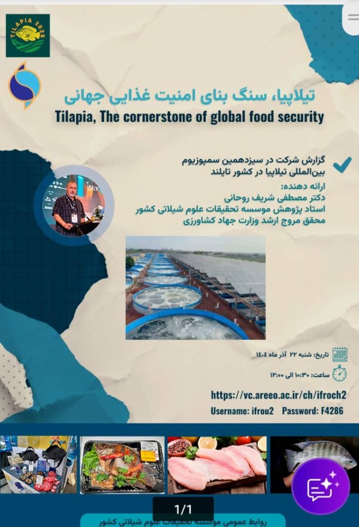 در این گزارش، آخرین یافتههای علمی و تجربیات مرتبط با نقش تیلاپیا در امنیت غذایی، توسعه پایدار آبزیپروری و چالشهای جهانی این صنعت تشریح خواهد شد. این ارائه بخشی از برنامههای مؤسسه تحقیقات علوم شیلاتی در جهت انتقال دانش و تجربههای بینالمللی به جامعه علمی و تولیدی کشور است.